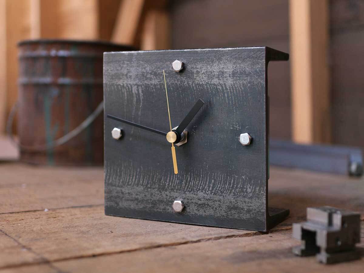 厚い鋼材を使用した重厚感のあるシンプルな置時計です。